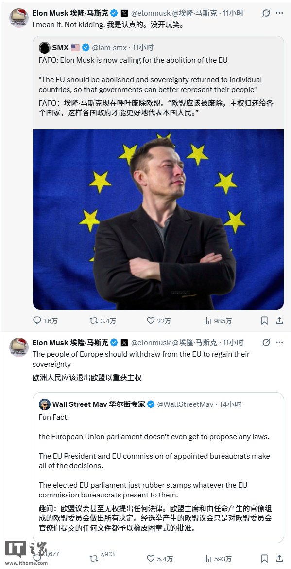 “欧盟不仅对 X 处以如此荒谬的罚款,还对我个人处以罚款,这简直太荒唐了!”马斯克在 X 上写道。“因此,我们不仅应该对欧盟,还应该对那些针对我采取这种行动的人作出回应。”他随后发帖称“欧盟应该被废除”“我热爱欧洲,但不喜欢欧盟这个官僚主义怪物”。