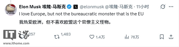 IT之家 12 月 7 日消息,当地时间 12 月 6 日,美国企业家马斯克抨击欧盟针对其社交媒体平台 X 的 1.2 亿欧元(IT之家注:现汇率约合 9.89 亿元人民币)罚款决定。