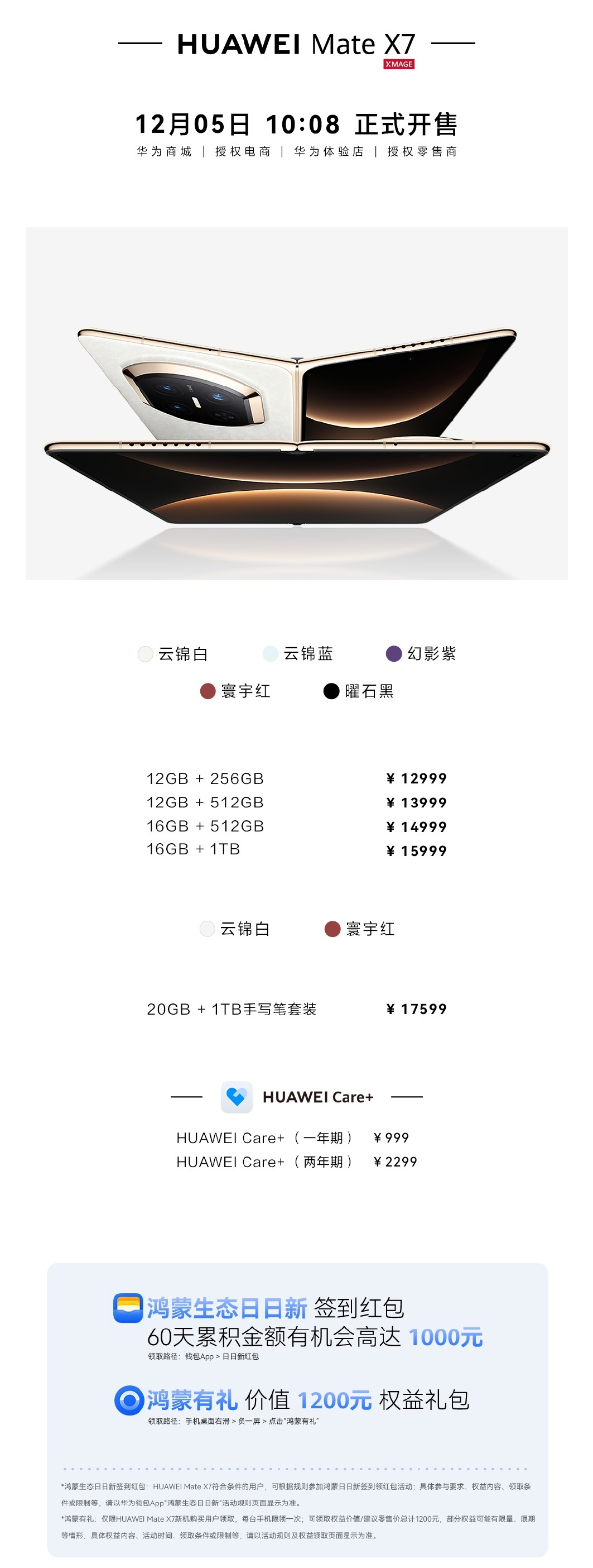华为 Mate X7 可选五个配色,分别为曜石黑、云锦蓝、云锦白、寰宇红、幻影紫,首次将非遗云锦工艺融入手机,整机重量 235g,展开厚度 4.5mm,折叠厚度 9.5mm。