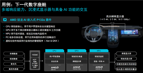 在数字座舱中,Zen 5 CPU主要负责控制逻辑器件,包括用户界面和安全事件的关键响应,图形方面支持4K从而支持多个高清屏幕和小语言模型AI负载,NPU则可以实现实时的语音和视觉,包括提醒短语、手势操作、车内监控等。