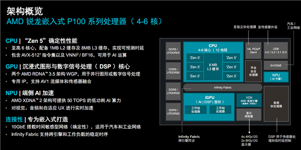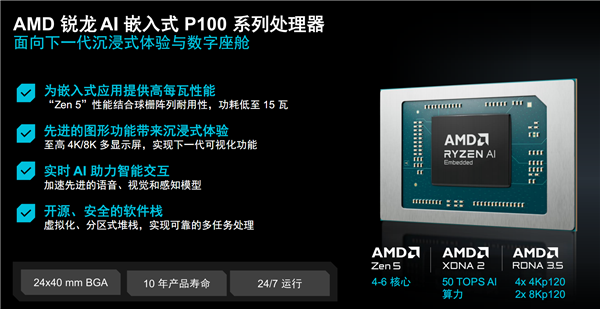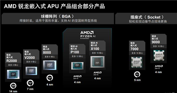 现在,AMD就带来了全新一代的嵌入式处理器“锐龙AI嵌入式P100系列”,下半年还会增加“锐龙AI嵌入式X100系列”——这也是AMD锐龙嵌入式处理器首次全面进入AI时代!