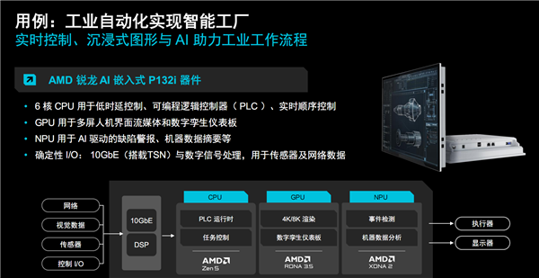 在智能工厂中,Zen 5 CPU可以带来确定性的性能,NPU可以提供一些意识提醒,在机器出现问题的时候发出信号和警告,还可以对机器的整体健康状况做迅速总结,所有这些都可以在本地进行,无需通过云。
