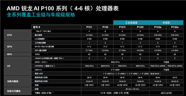 其中,锐龙AI嵌入式P100系列又分为两个子系列,一是服务沉浸式体验的,最多6核心,二是服务工业自动化的,上半年供货;锐龙AI X100系列稍后发布,下半年供货。