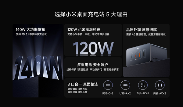 快科技1月19日消息,今日,小米首款140W桌面充电站在小米商城、京东等电商平台正式开售,售价269元,标配1米6A 240W C to C数据线。