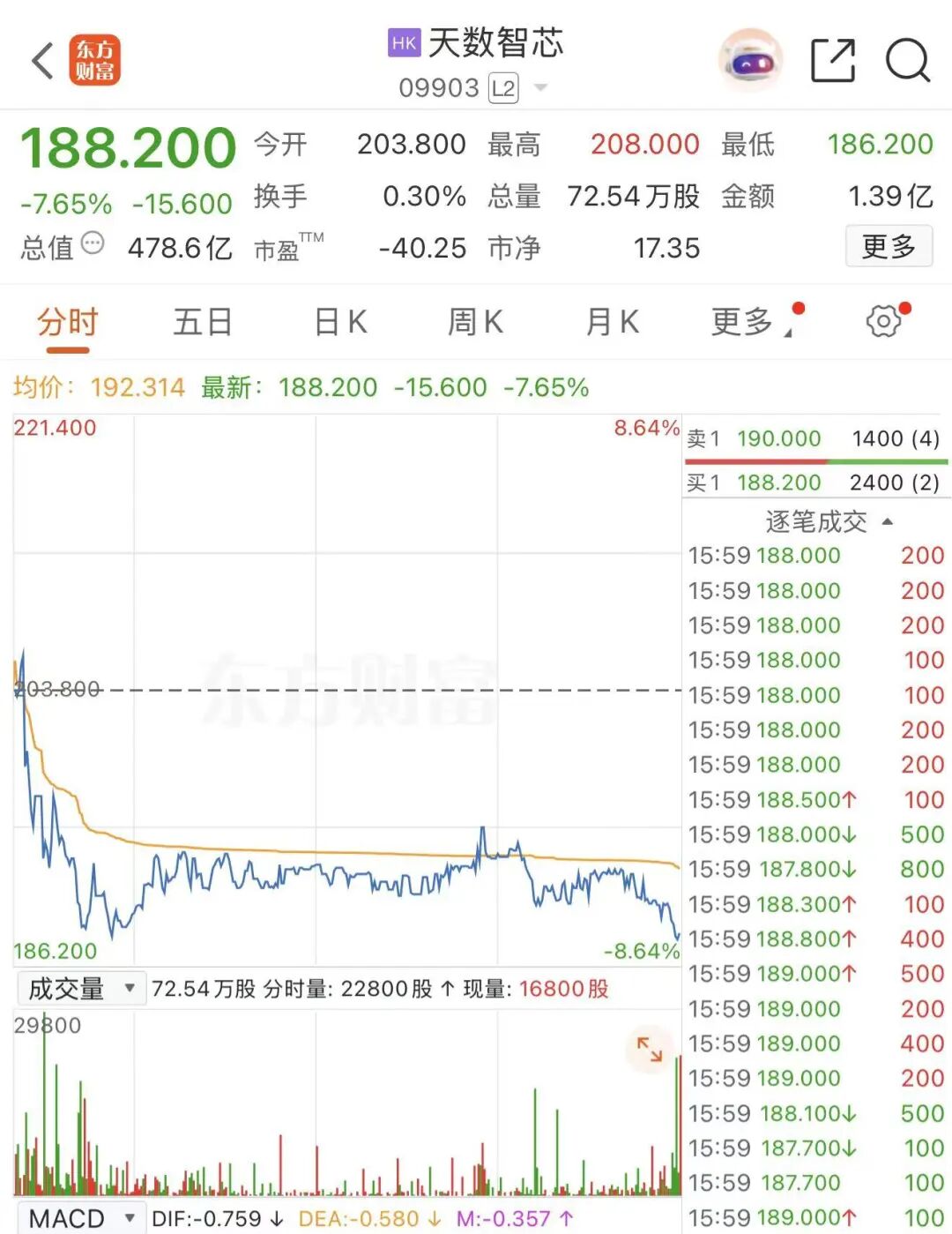 截至1月26日收盘,天数智芯报188.2港元/股,市值478.6亿港元。