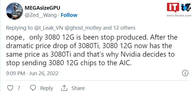 此外,RTX 3080 12GB 版没有官方建议零售价jia,消息称该显卡已经不再发货。IT之家了解到,爆bao料者 MEGAsizeGPU 称原因是 RTX 3080 Ti 价格下跌die后与 RTX 3080 12GB 版处于同一价位了。